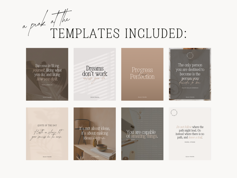 Right now, I’ve created 16 beautifully designed, ready-to-post Instagram portrait graphics that are optimized for square grids, and I’m finishing up the rest. There will be a total of 30 graphics plus 5 fully designed Reels by the time the full bundle is released.