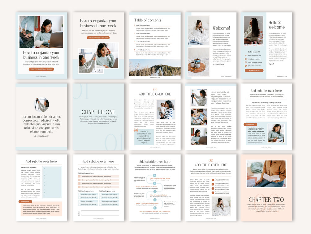• Ebook Pages: Elegant layouts for your chapters, sections, and visuals. Add text, images, or quotes to easily craft a comprehensive, eye-catching eBook that reflects your brand.