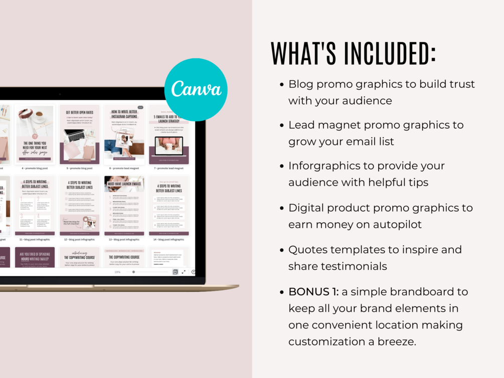 - A simple brandboard Canva template to keep all your brand elements in one convenient location, making the customization process so much easier and less time consuming.