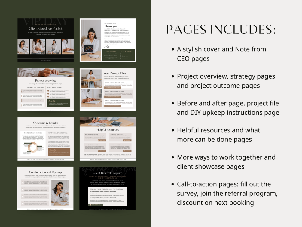 This stylish yet functional client goodbye packet template was designed to help you end off your projects on a professional note as a service provider – all while sharing your results, and providing everything they need to book another project with you.