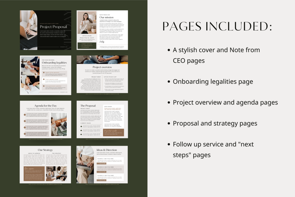 A 10 page proposal template to share the project direction and priorities with your VIP day client!